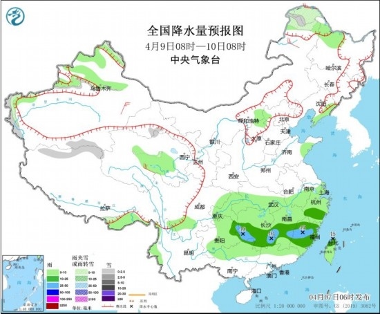 4月9日08時至10日08時,內(nèi)蒙古東部、新疆南疆西部山區(qū)有小到中雪或雨夾雪,貴州東部、湖南中南部、江西中南部、浙江南部、福建、臺灣島中北部等地有中到大雨(25~45毫米)。內(nèi)蒙古中部和東部、陜西中北部、山西部分地區(qū)有4~6級風(fēng),陣風(fēng)7級。