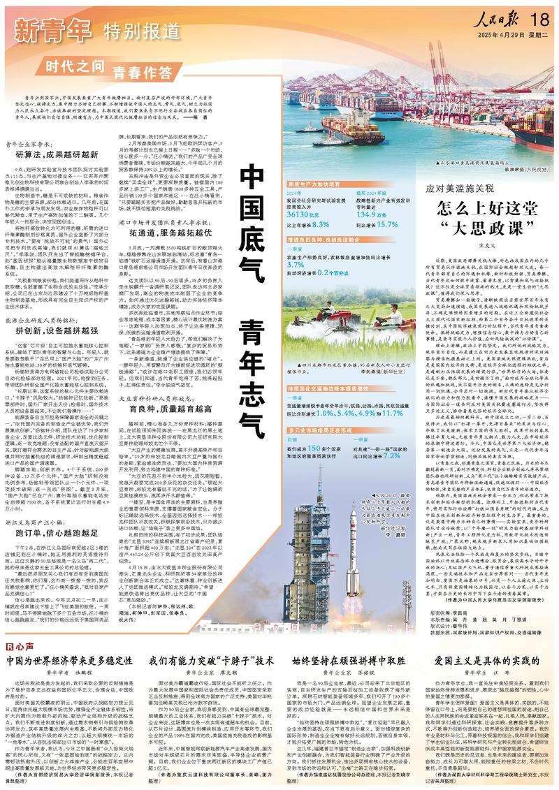 青年興則國(guó)家興,中國(guó)發(fā)展要靠廣大青年挺膺擔(dān)當(dāng)。面對(duì)復(fù)雜嚴(yán)峻的外部環(huán)境,廣大青年堅(jiān)定信心、保持定力,集中精力辦好自己的事,不斷增強(qiáng)做中國(guó)人的志氣、骨氣、底氣,樹(shù)立為祖國(guó)為人民永久奮斗、赤誠(chéng)奉獻(xiàn)的堅(jiān)定理想。本期報(bào)道,我們聚焦來(lái)自不同行業(yè)奮戰(zhàn)在各自崗位的青年人,展現(xiàn)他們自信自強(qiáng)、剛健有為,為中國(guó)式現(xiàn)代化挺膺擔(dān)當(dāng)?shù)男拍钆c風(fēng)采。