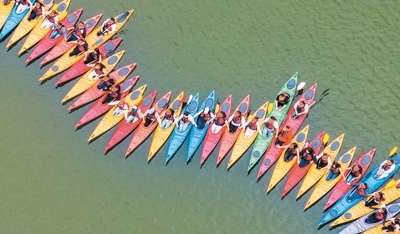 4月25日,重慶市南川區(qū)黎香湖鎮(zhèn)黎香湖皮劃艇基地,游客們在湖里體驗水上運動樂趣。據(jù)介紹,“五一”假期期間該皮劃艇基地已預約滿員。