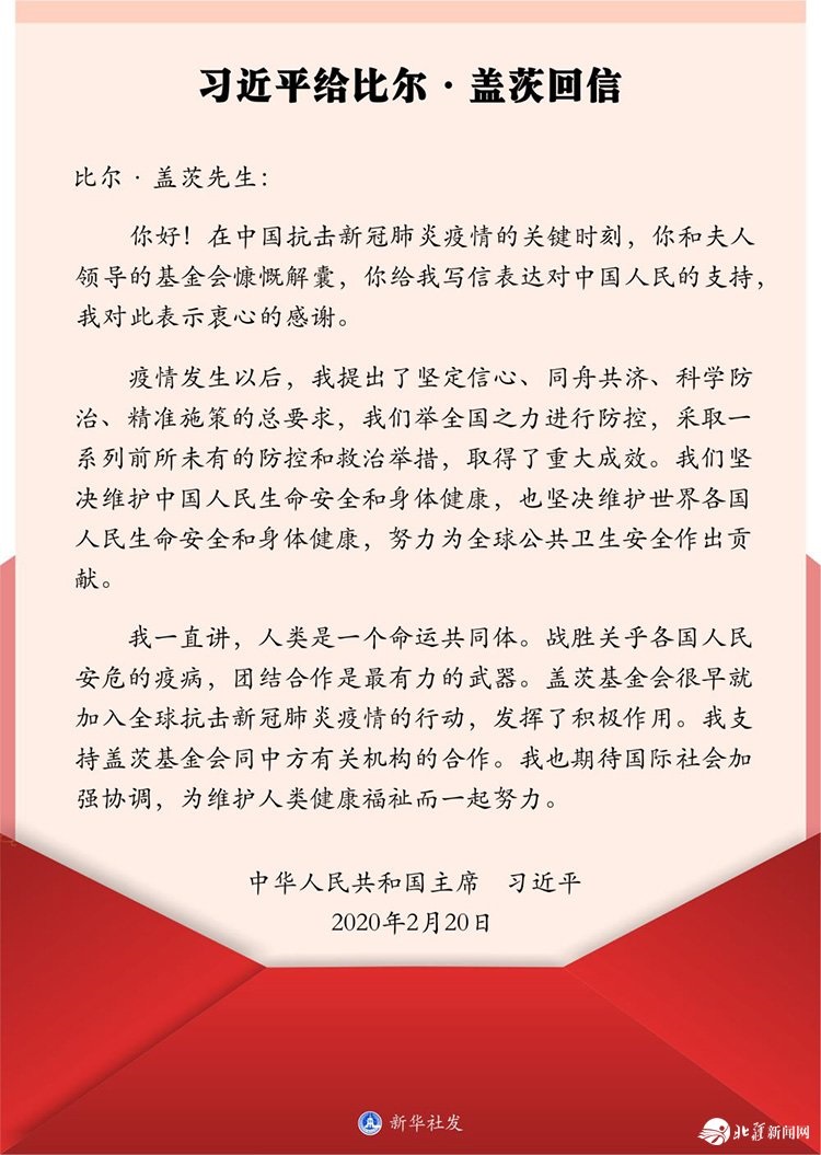比爾·蓋茨專門致信習(xí)近平主席,贊賞中國政府和中國人民在抗擊疫情中的表現(xiàn),表示將堅(jiān)定支持中國打贏這場關(guān)鍵戰(zhàn)役。
