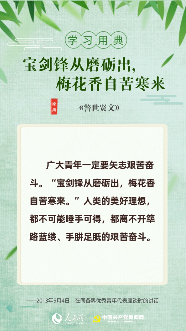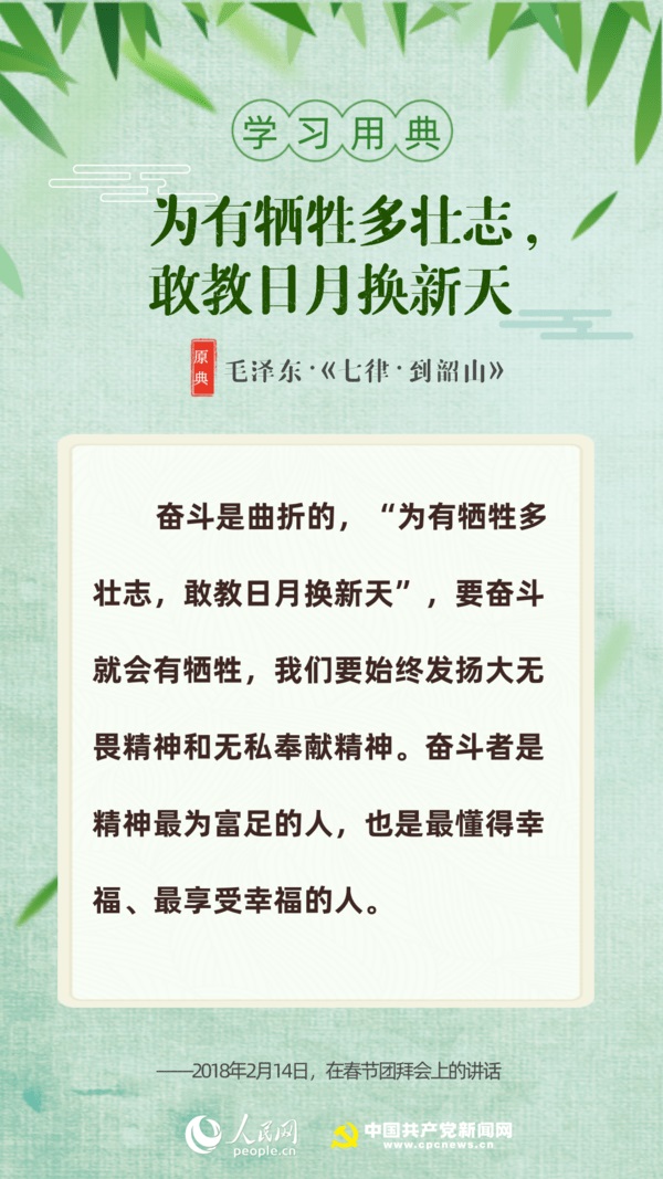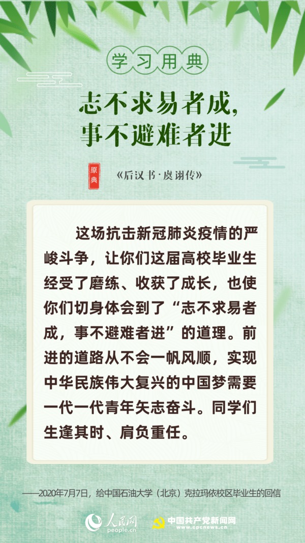 【編者按】“志不求易者成,事不避難者進(jìn)?!苯?,習(xí)近平總書記給中國(guó)石油大學(xué)(北京)克拉瑪依校區(qū)畢業(yè)生回信,對(duì)廣大高校畢業(yè)生提出殷切期望。“人生在勤,勤則不匱”“積土而為山,積水而為?!薄陙?lái),習(xí)近平多次引用詩(shī)句典故,激勵(lì)包含廣大青年在內(nèi)的全黨全國(guó)各族人民拼搏奮進(jìn)、埋頭苦干。正值“戰(zhàn)疫”“戰(zhàn)貧”關(guān)鍵時(shí)刻,人民網(wǎng)·中國(guó)共產(chǎn)黨新聞網(wǎng)與您一起回顧習(xí)近平講話中關(guān)于“奮斗”的10個(gè)名句。
