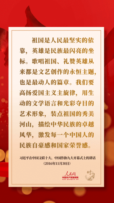 祖國是人民最堅實(shí)的依靠,英雄是民族最閃亮的坐標(biāo)。歌唱祖國、禮贊英雄從來都是文藝創(chuàng)作的永恒主題,也是最動人的篇章。我們要高揚(yáng)愛國主義主旋律,用生動的文學(xué)語言和光彩奪目的藝術(shù)形象,裝點(diǎn)祖國的秀美河山,描繪中華民族的卓越風(fēng)華,激發(fā)每一個中國人的民族自豪感和國家榮譽(yù)感。