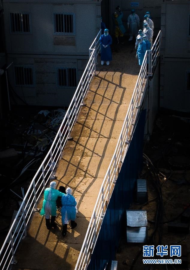 醫(yī)護(hù)人員將患者送入武漢火神山醫(yī)院病房(2020年2月4日攝,無人機(jī)照片)。新華社記者肖藝九攝