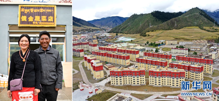 2020年9月22日拍攝的拼版照片:左圖為西藏自治區(qū)昌都市類烏齊縣長毛嶺鄉(xiāng)達(dá)雄村村民俄金(右)和妻子阿丁在安置點(diǎn)俄金蔬菜店前;右圖為類烏齊縣桑多扶貧開發(fā)區(qū)易地扶貧搬遷安置點(diǎn)一角(無人機(jī)照片)。新華社記者詹彥攝