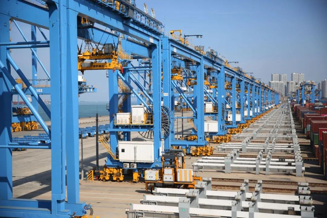 △10月8日,位于山東自貿(mào)區(qū)青島片區(qū)的山東港口青島港全自動(dòng)化碼頭集裝箱堆場(chǎng)一派繁忙景象。