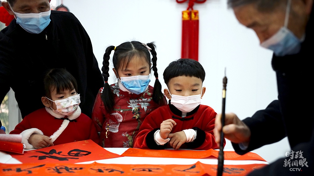 △金元社區(qū)居民活動(dòng)室內(nèi),孩子們觀摩書法寫作。(總臺(tái)央視記者王哈男拍攝)