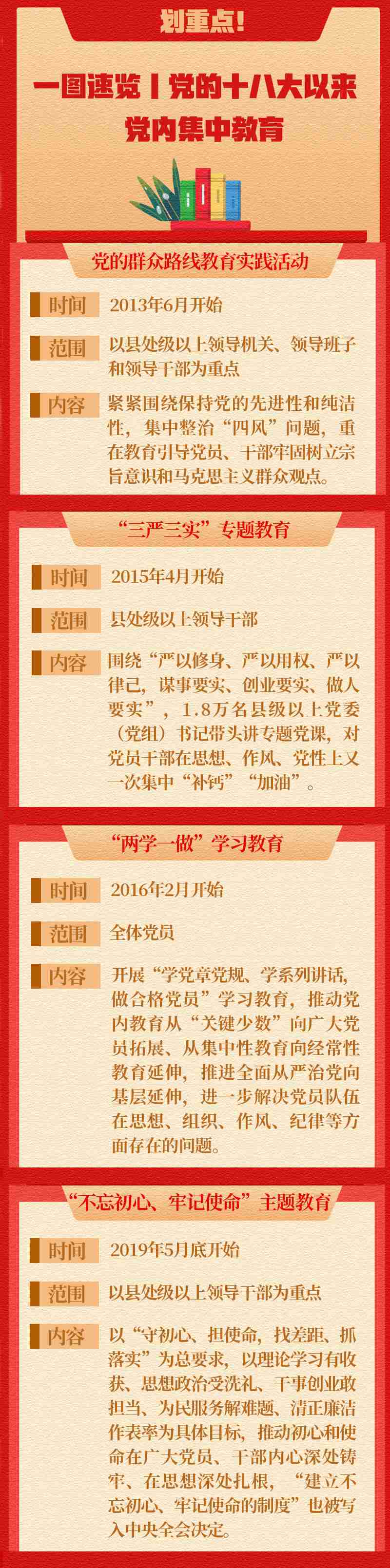 回看黨的十八大以來(lái),從黨的群眾路線教育實(shí)踐活動(dòng)、“三嚴(yán)三實(shí)”專題教育、“兩學(xué)一做”學(xué)習(xí)教育、“不忘初心、牢記使命”主題教育……黨內(nèi)思想教育緊扣黨和國(guó)家中心工作展開,在不同時(shí)期有不同的切入角度,貫穿的一條主線就是加強(qiáng)黨的執(zhí)政能力建設(shè)和先進(jìn)性建設(shè)。