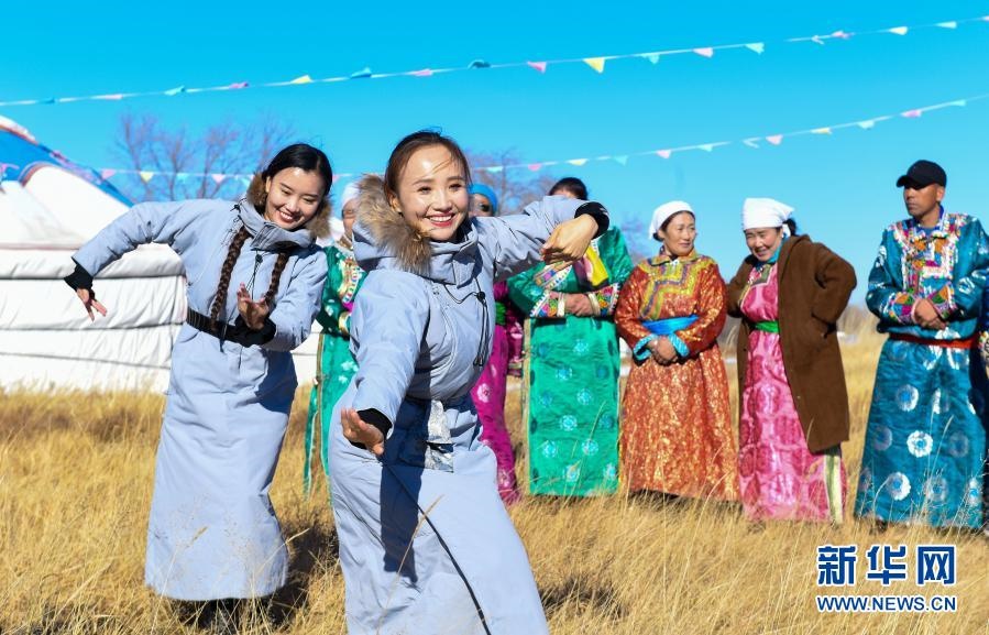 2018年11月9日,內(nèi)蒙古自治區(qū)錫林郭勒盟烏蘭牧騎隊(duì)員來到西烏珠穆沁旗烏蘭哈拉嘎蘇木新高勒嘎查的黨員中心戶恩克巴雅爾家,為周邊牧民表演舞蹈。新華社記者 彭源 攝