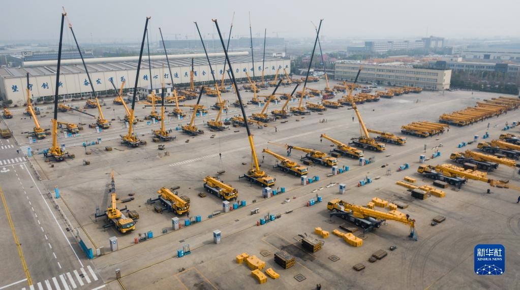 這是2019年4月4日在徐工集團(tuán)徐州重型機(jī)械有限公司拍攝的調(diào)試中的起重機(jī)(無(wú)人機(jī)照片)。新華社記者 李響 攝