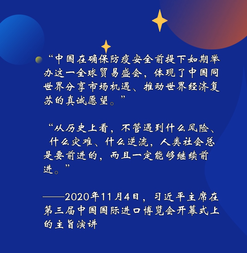 突如其來的新冠肺炎疫情給各國帶來嚴(yán)重沖擊,也給世界經(jīng)濟(jì)帶來重創(chuàng)。在2020年舉行的第三屆進(jìn)博會上,習(xí)近平主席誠摯的話語,為世界注入強(qiáng)大信心——