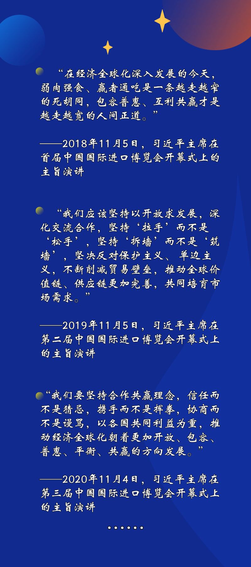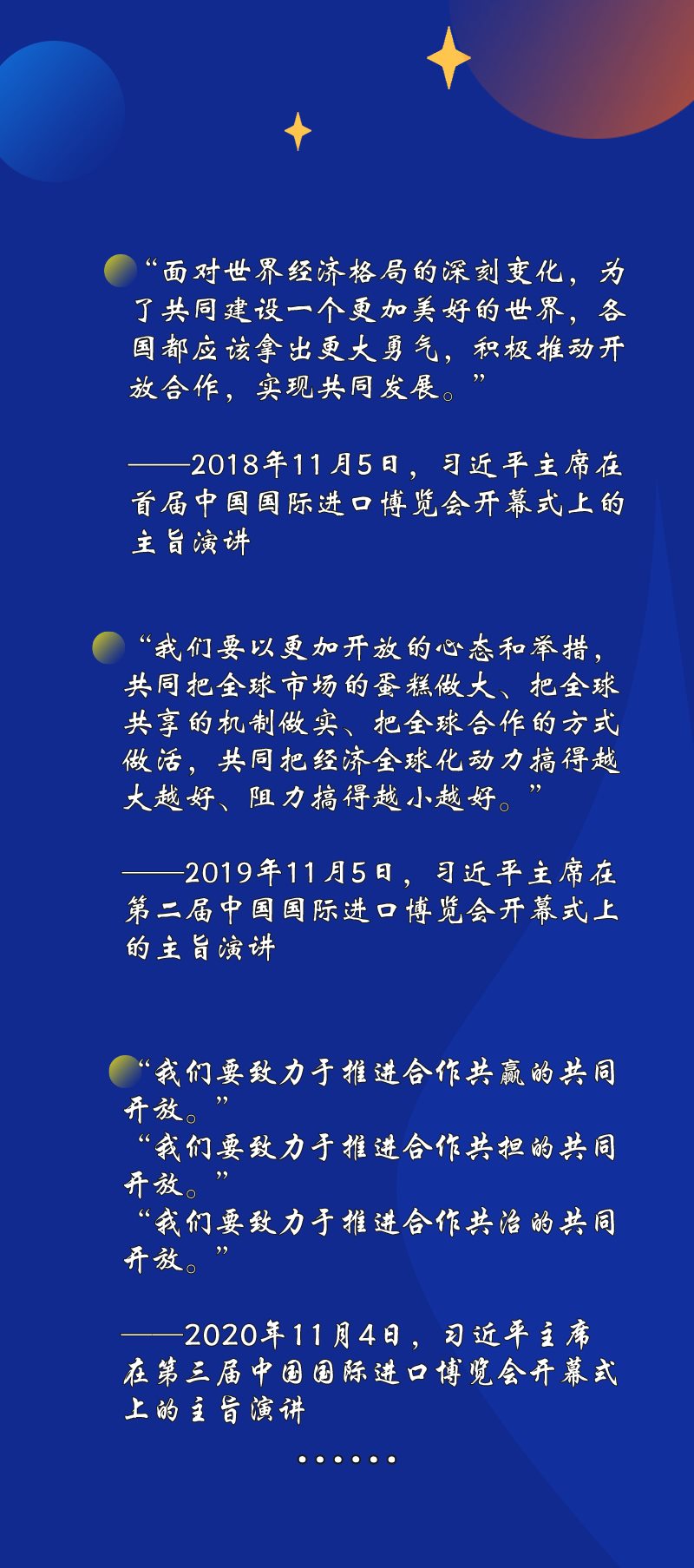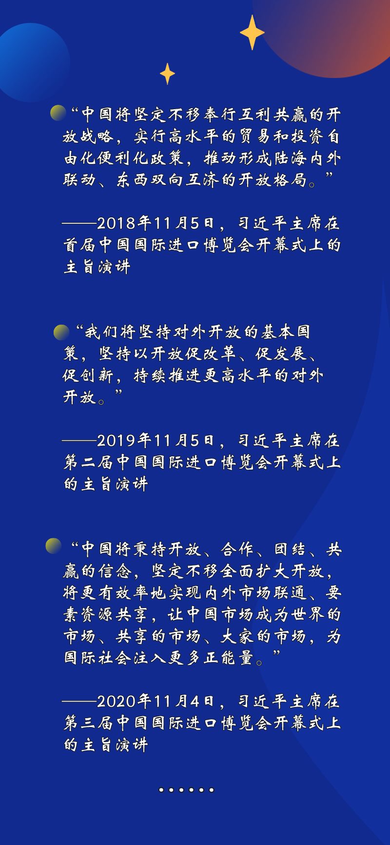 “持續(xù)放寬市場準(zhǔn)入”“繼續(xù)優(yōu)化營商環(huán)境”“深化雙邊、多邊、區(qū)域合作”……習(xí)近平主席在進(jìn)博會上宣布中國擴(kuò)大開放的一系列重大舉措。