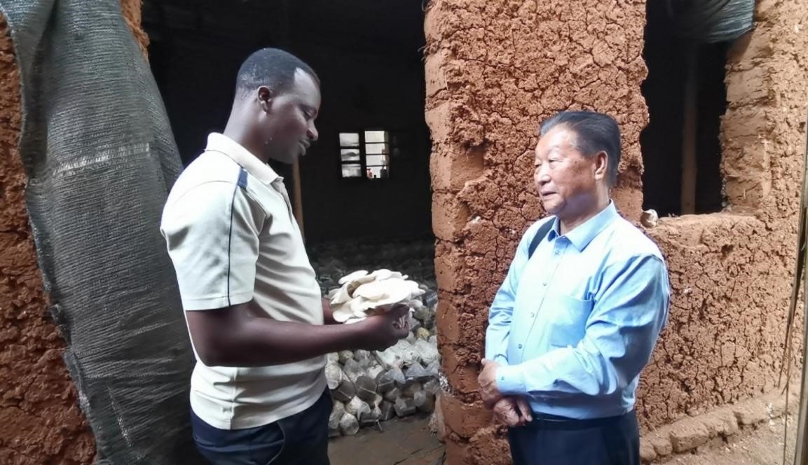 2019年,林占熺在盧旺達指導當?shù)剞r(nóng)戶菌草種菇。圖片來源:國家菌草工程技術研究中心