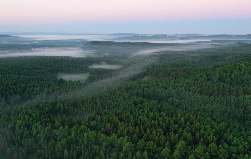 2021年6月27日拍攝的塞罕壩國(guó)家森林公園晨景(無人機(jī)照片)。新華社記者楊世堯攝