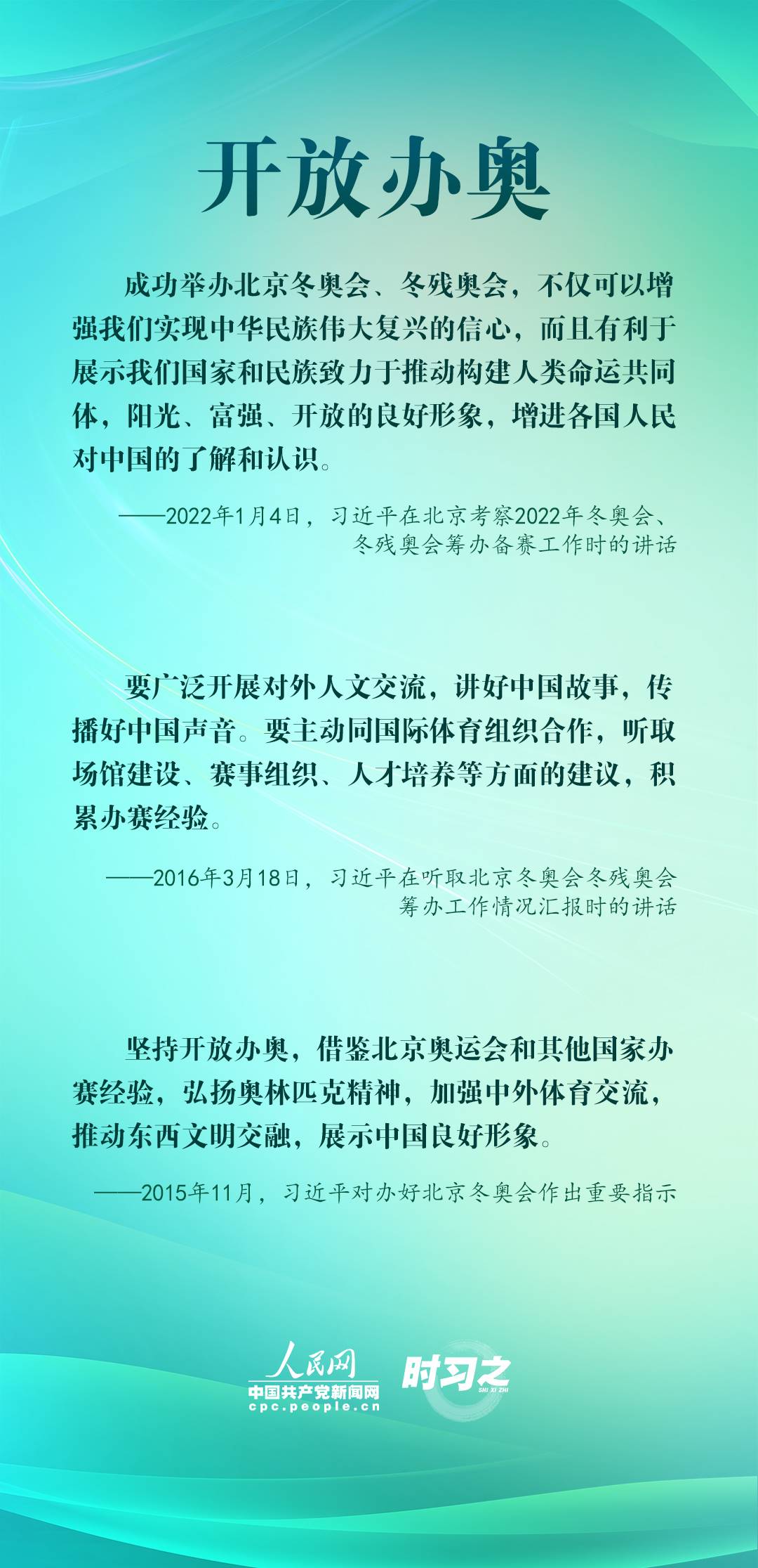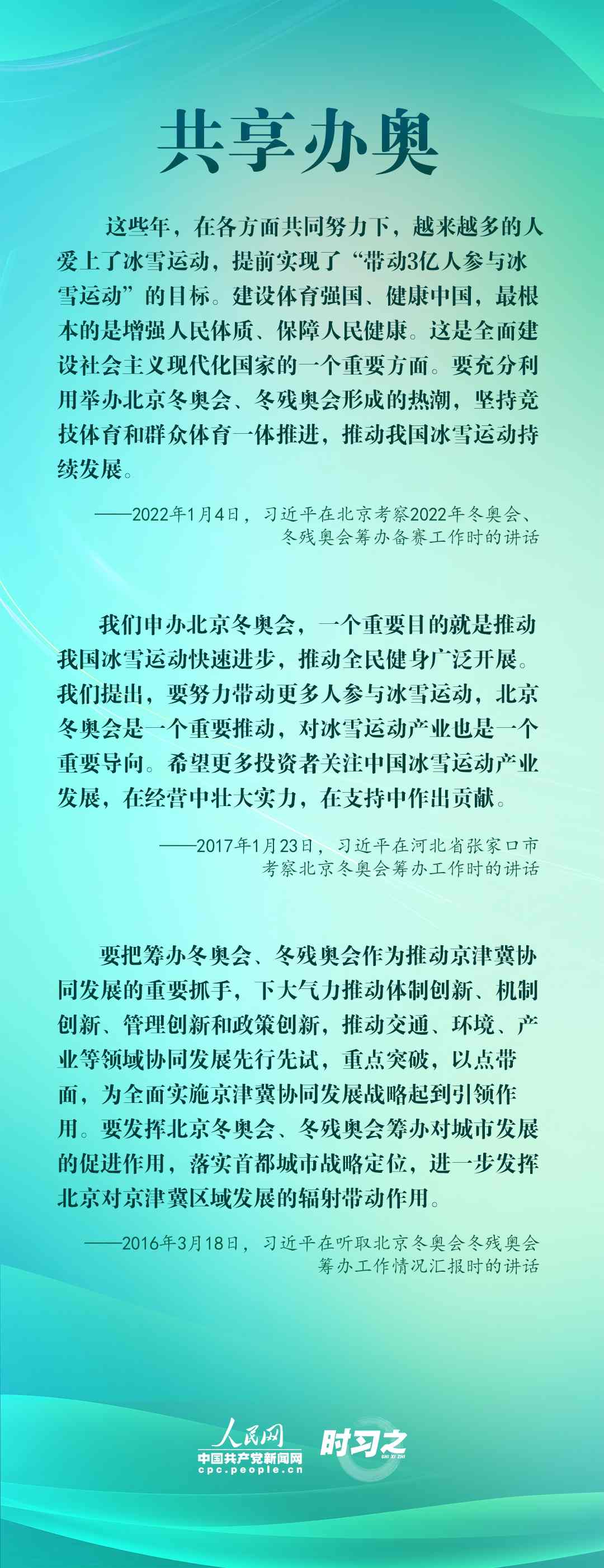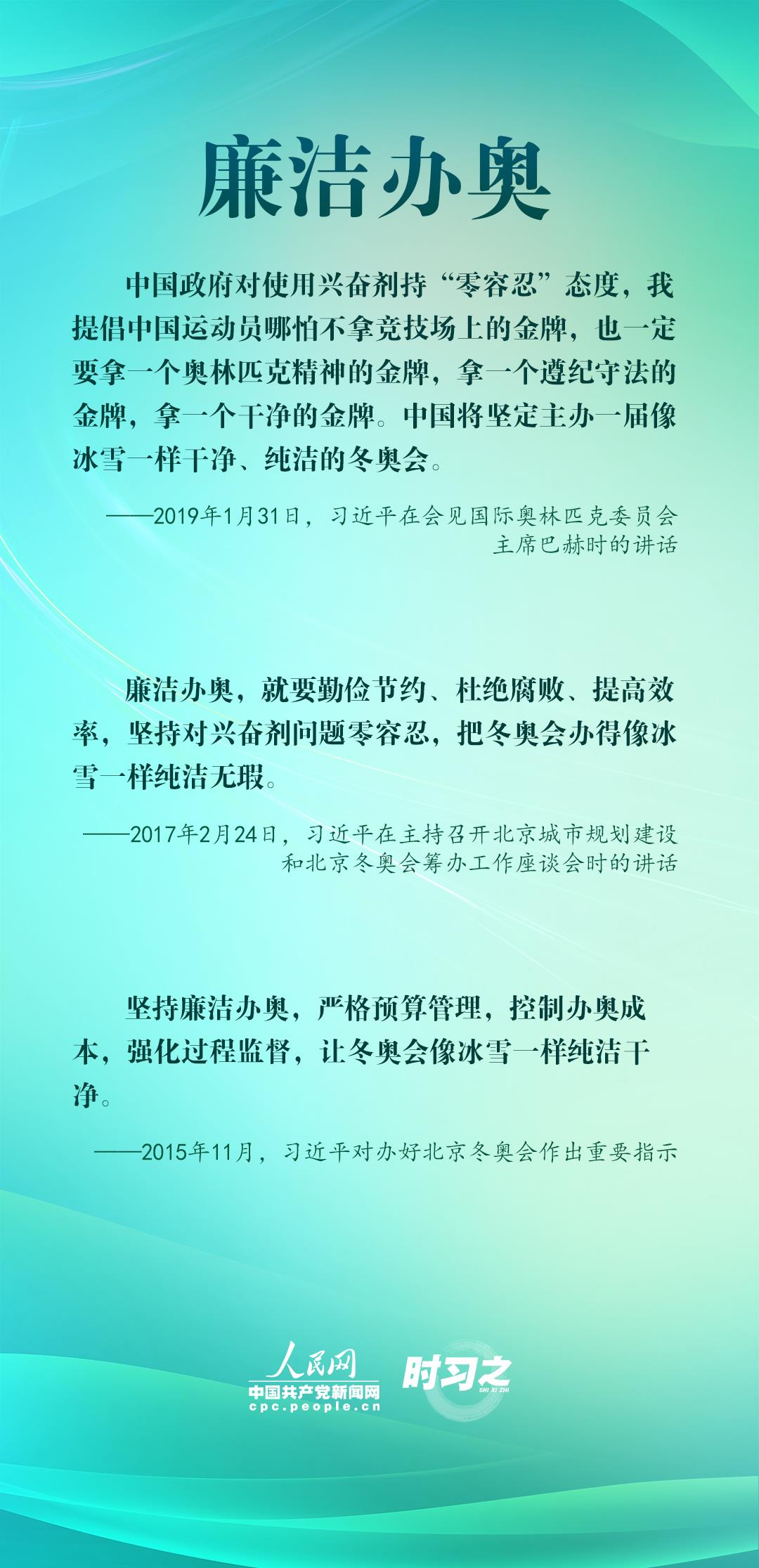 1月4日,習(xí)近平在北京考察2022年冬奧會、冬殘奧會籌辦備賽工作,指出“要堅持綠色辦奧、共享辦奧、開放辦奧、廉潔辦奧的理念,突出科技、智慧、綠色、節(jié)儉特色”。辦好北京冬奧會、冬殘奧會,是中國向國際社會作出的莊嚴(yán)承諾。習(xí)近平多次調(diào)研并強調(diào)綠色、共享、開放、廉潔的辦奧理念。