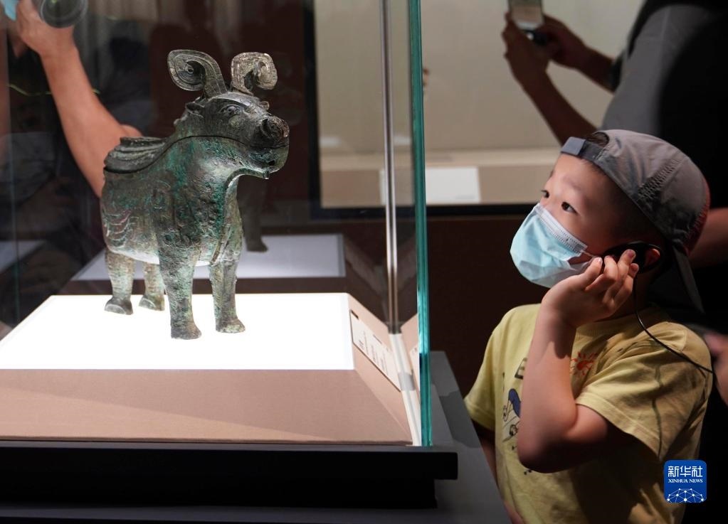小朋友在上海博物館舉行的“宅茲中國——河南夏商周三代文明展”上參觀(2022年7月30日攝)。新華社記者任瓏攝