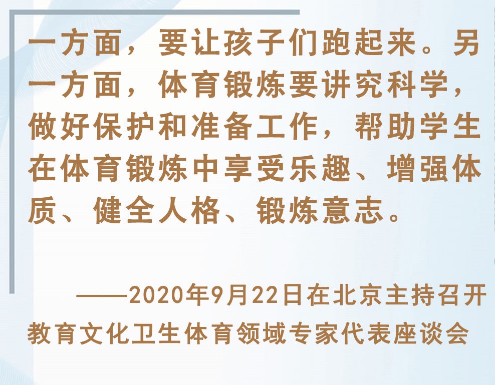 青少年是祖國的未來、民族的希望。強(qiáng)健的體魄是青少年成長成才的重要前提。對加強(qiáng)體育教育,增強(qiáng)青少年體質(zhì),習(xí)近平總書記念茲在茲。