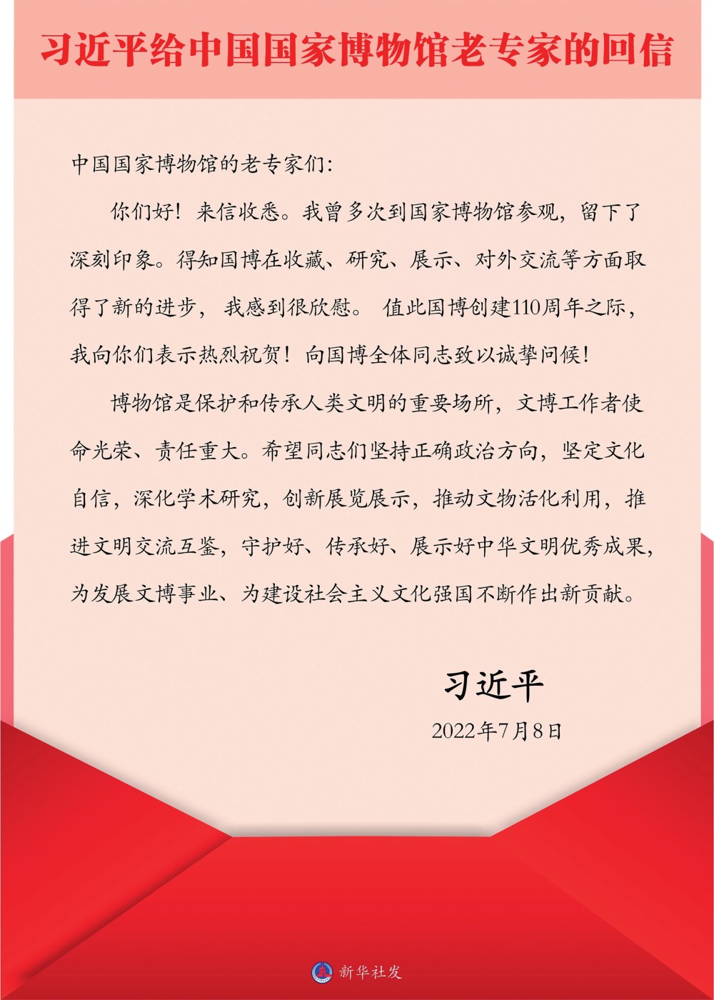 7月8日,中共中央總書記、國家主席、中央軍委主席習(xí)近平給中國國家博物館的老專家回信,在國博創(chuàng)建110周年之際,向國博全體同志致以熱烈祝賀和誠摯問候。