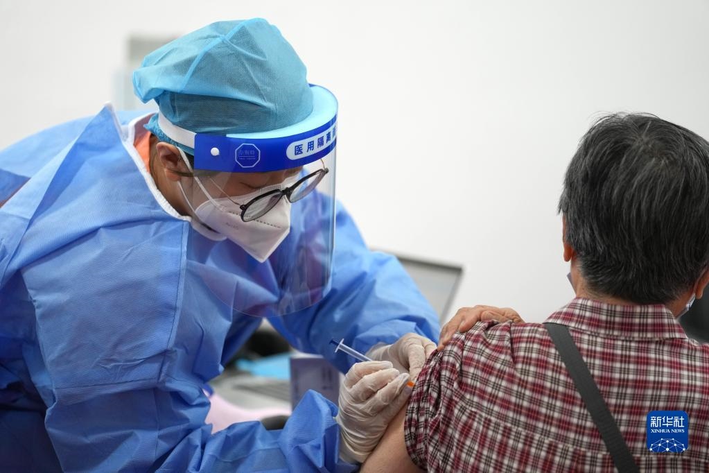 2022年7月13日,在北京市朝陽區(qū)奧運(yùn)村街道一處新冠疫苗接種點(diǎn),醫(yī)護(hù)人員為一名86歲的市民接種新冠疫苗加強(qiáng)針。新華社記者 鞠煥宗 攝
