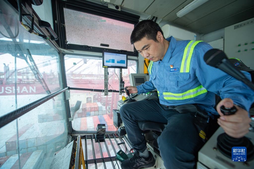 2022年5月24日,竺士杰在浙江寧波市北侖區(qū)穿山港區(qū)港口橋吊上作業(yè)。新華社記者 江漢 攝