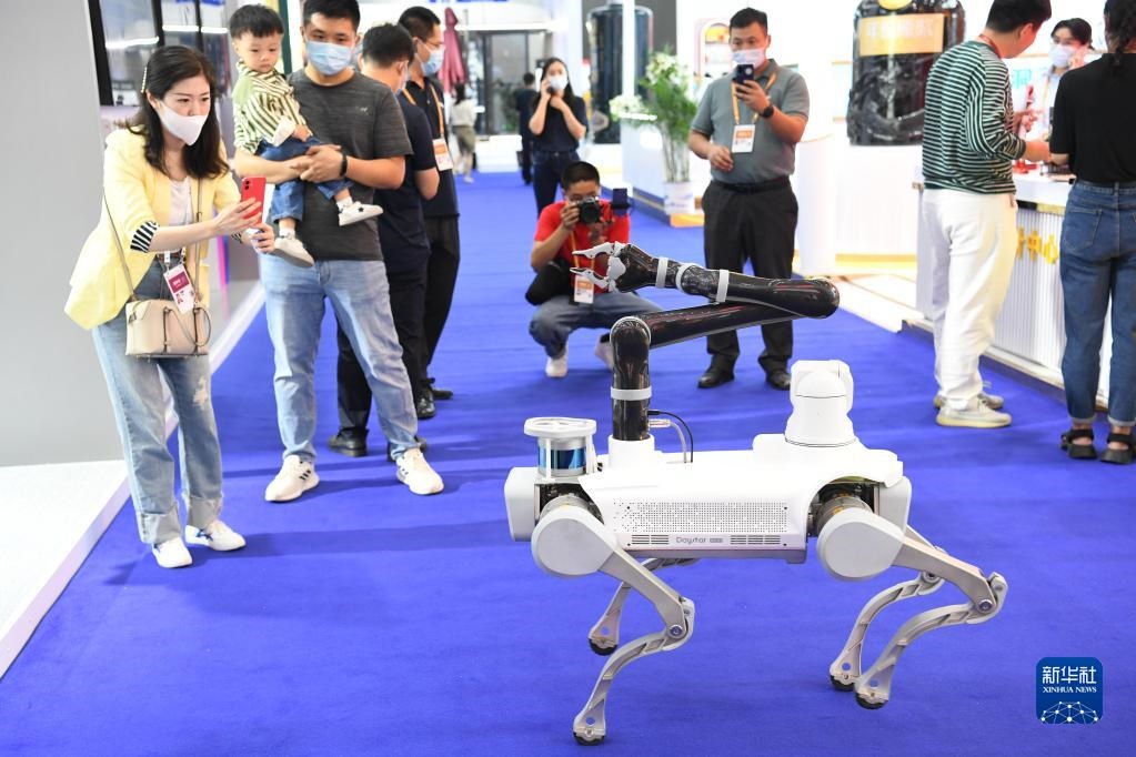 參觀者在安徽合肥舉辦的2022世界制造業(yè)大會(huì)上拍攝展出的一款四足巡檢機(jī)器人(2022年9月20日攝)。新華社記者 張端 攝