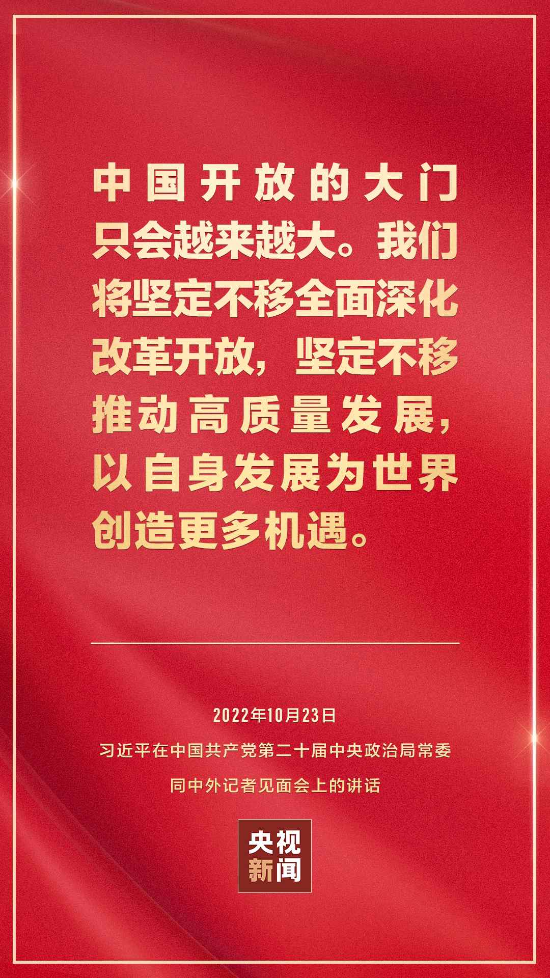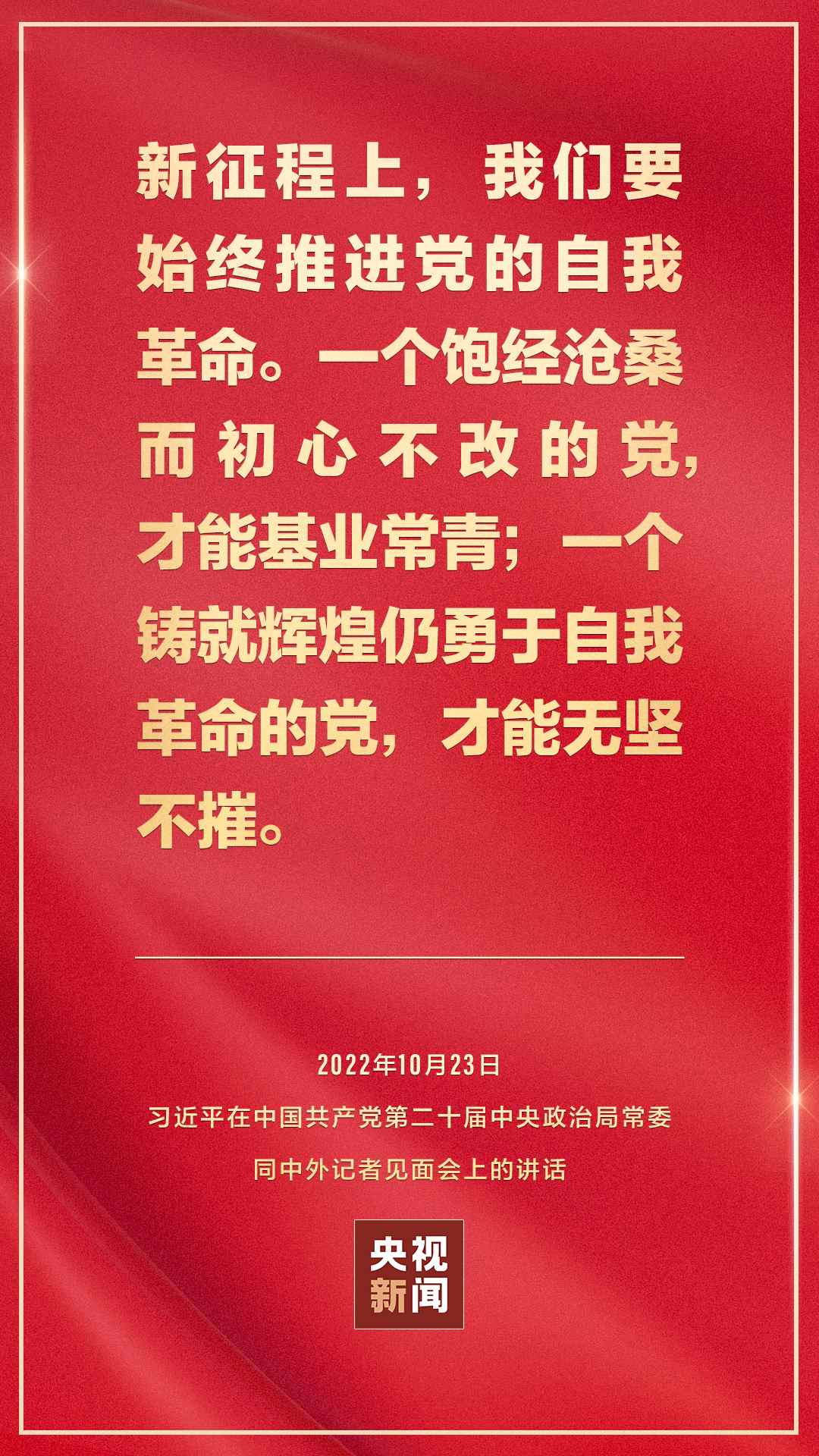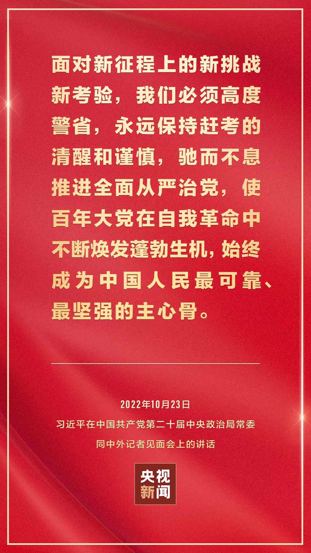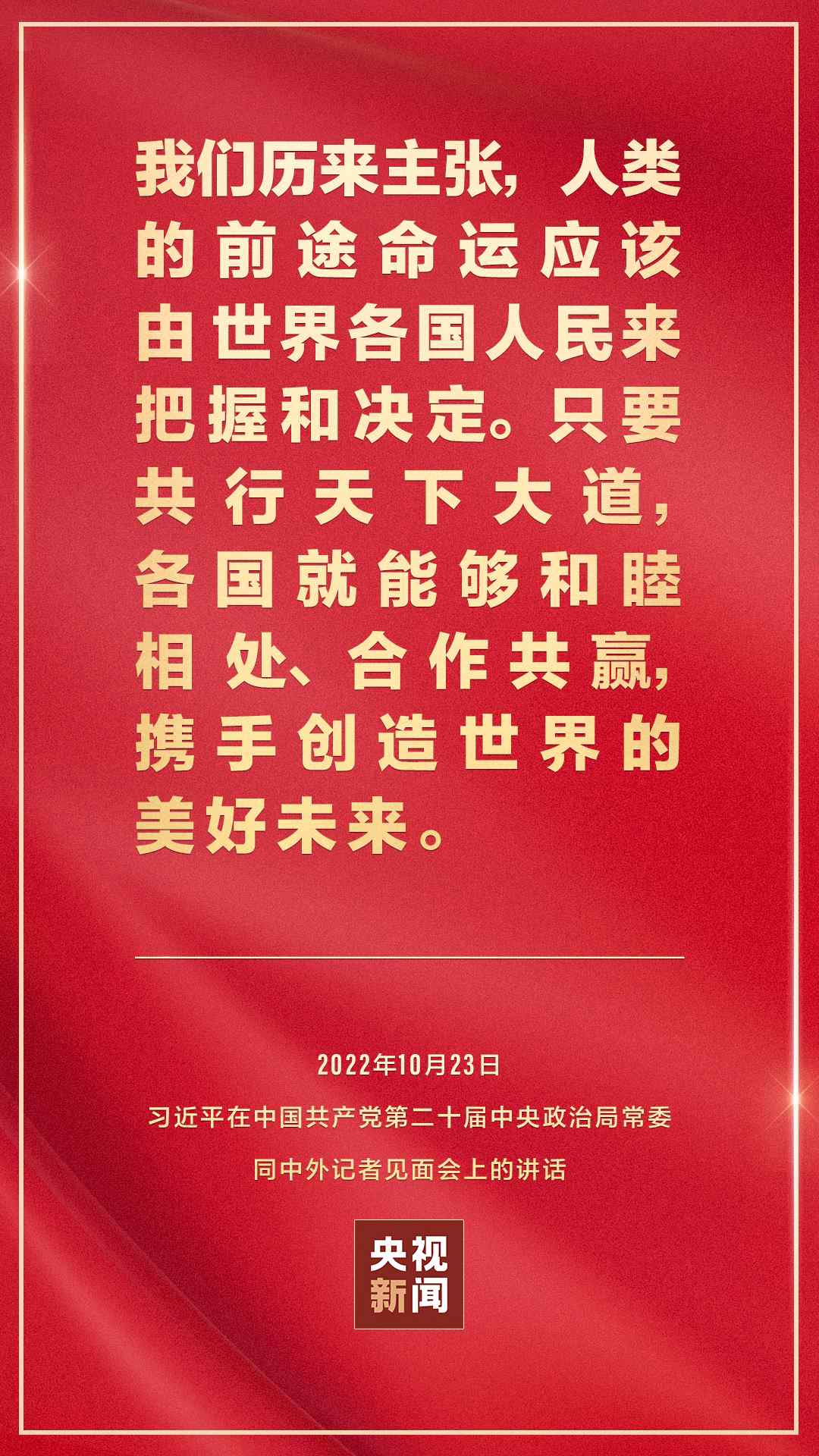 在中國共產(chǎn)黨第二十屆中央委員會(huì)第一次全體會(huì)議上當(dāng)選的中共中央總書記習(xí)近平和中共中央政治局常委李強(qiáng)、趙樂際、王滬寧、蔡奇、丁薛祥、李希,23日中午在人民大會(huì)堂同采訪中共二十大的中外記者見面。習(xí)近平發(fā)表重要講話。