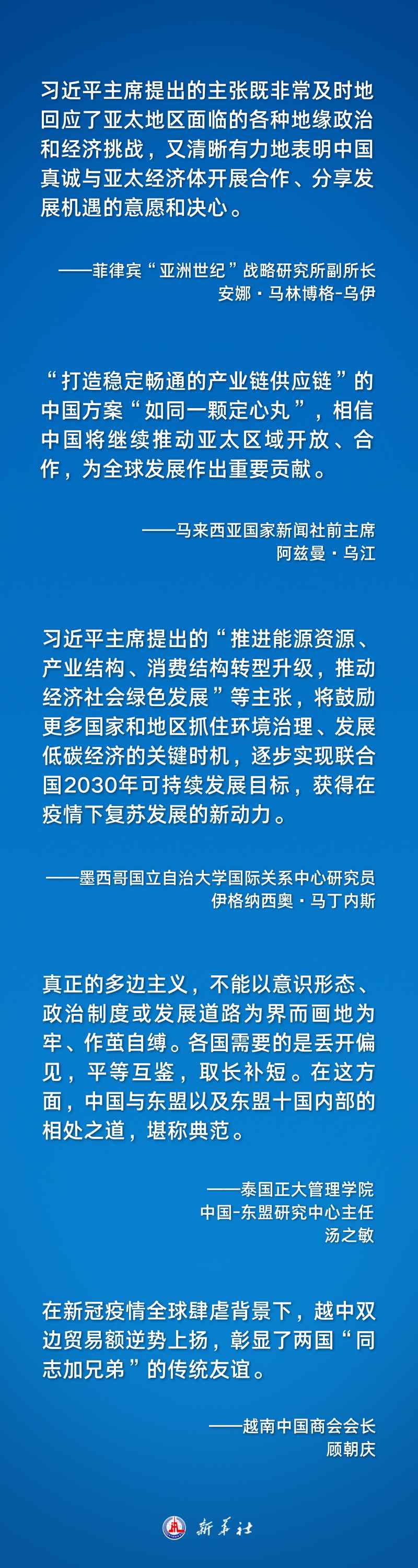 習(xí)近平主席的系列重要講話在國(guó)際社會(huì)引發(fā)熱烈反響。多國(guó)人士認(rèn)為,習(xí)近平主席全面總結(jié)了“亞太奇跡”的經(jīng)驗(yàn)與啟示,就攜手構(gòu)建亞太命運(yùn)共同體提出重要主張,深刻闡釋了中國(guó)式現(xiàn)代化的機(jī)遇與貢獻(xiàn),為再創(chuàng)亞太合作新輝煌注入強(qiáng)勁動(dòng)力。