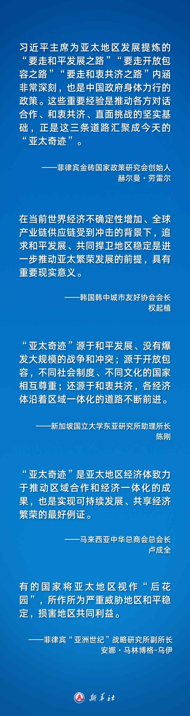 對(duì)于亞太未來(lái)發(fā)展繁榮,習(xí)近平主席提出重要主張:要攜手構(gòu)建亞太命運(yùn)共同體,再創(chuàng)亞太合作新輝煌。多國(guó)人士認(rèn)為,“維護(hù)國(guó)際公平正義,建設(shè)和平穩(wěn)定的亞太”“堅(jiān)持開(kāi)放包容,建設(shè)共同富裕的亞太”“堅(jiān)持綠色低碳發(fā)展,建設(shè)清潔美麗的亞太”“堅(jiān)持命運(yùn)與共,建設(shè)守望相助的亞太”為亞太地區(qū)未來(lái)發(fā)展指明了方向和路徑。