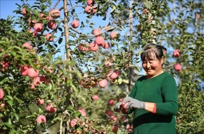 △2022年10月,果農(nóng)在延安市洛川縣阿寺村一處果園采摘。
