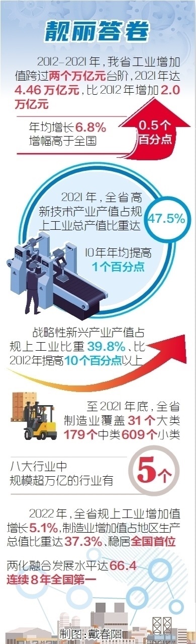 制造業(yè)規(guī)模實(shí)力保持領(lǐng)先。我省把制造業(yè)高質(zhì)量發(fā)展擺在更加突出位置,加快傳統(tǒng)產(chǎn)業(yè)轉(zhuǎn)型和戰(zhàn)略性新興產(chǎn)業(yè)發(fā)展,推進(jìn)產(chǎn)業(yè)邁向中高端水平。工業(yè)增加值10年跨過3萬億、4萬億兩個(gè)臺階,2021年達(dá)4.46萬億元,比2012年增加2.0萬億元,年均增長6.8%,增幅高于全國0.5個(gè)百分點(diǎn)。
