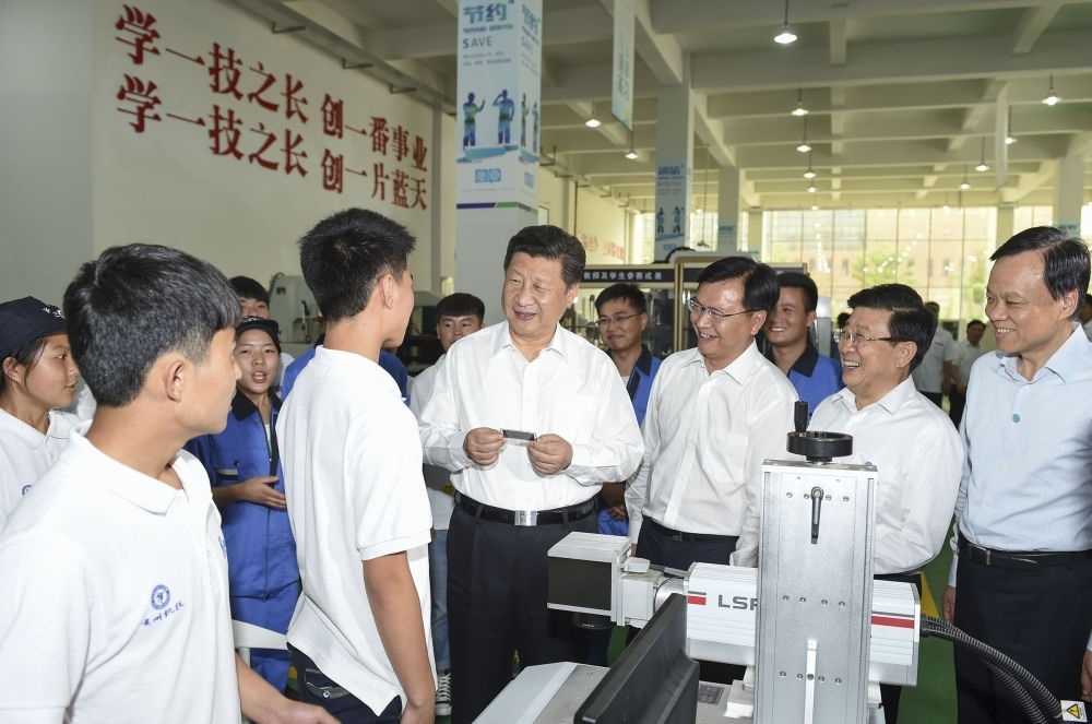 2015年6月17日,習近平在貴州省機械工業(yè)學校實訓基地勉勵學生加強操作訓練、不斷取得優(yōu)異成績。