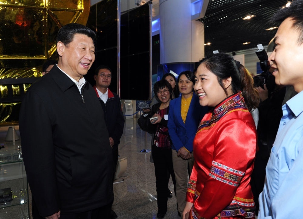 2013年5月4日,習近平來到中國航天科技集團公司中國空間技術(shù)研究院,同各界優(yōu)秀青年代表座談并發(fā)表重要講話。這是座談會前,習近平和在展廳參觀的優(yōu)秀青年代表交談。