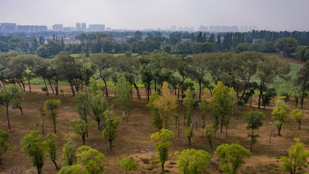 2020年9月27日拍攝的陜西省靖邊縣城旁的西草灘濕地公園(無人機(jī)照片)。新華社記者 陶明 攝