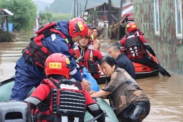 △8月4日,在黑龍江尚志市一面坡鎮(zhèn)萬山村,哈爾濱市森林消防隊員解救被困村民。