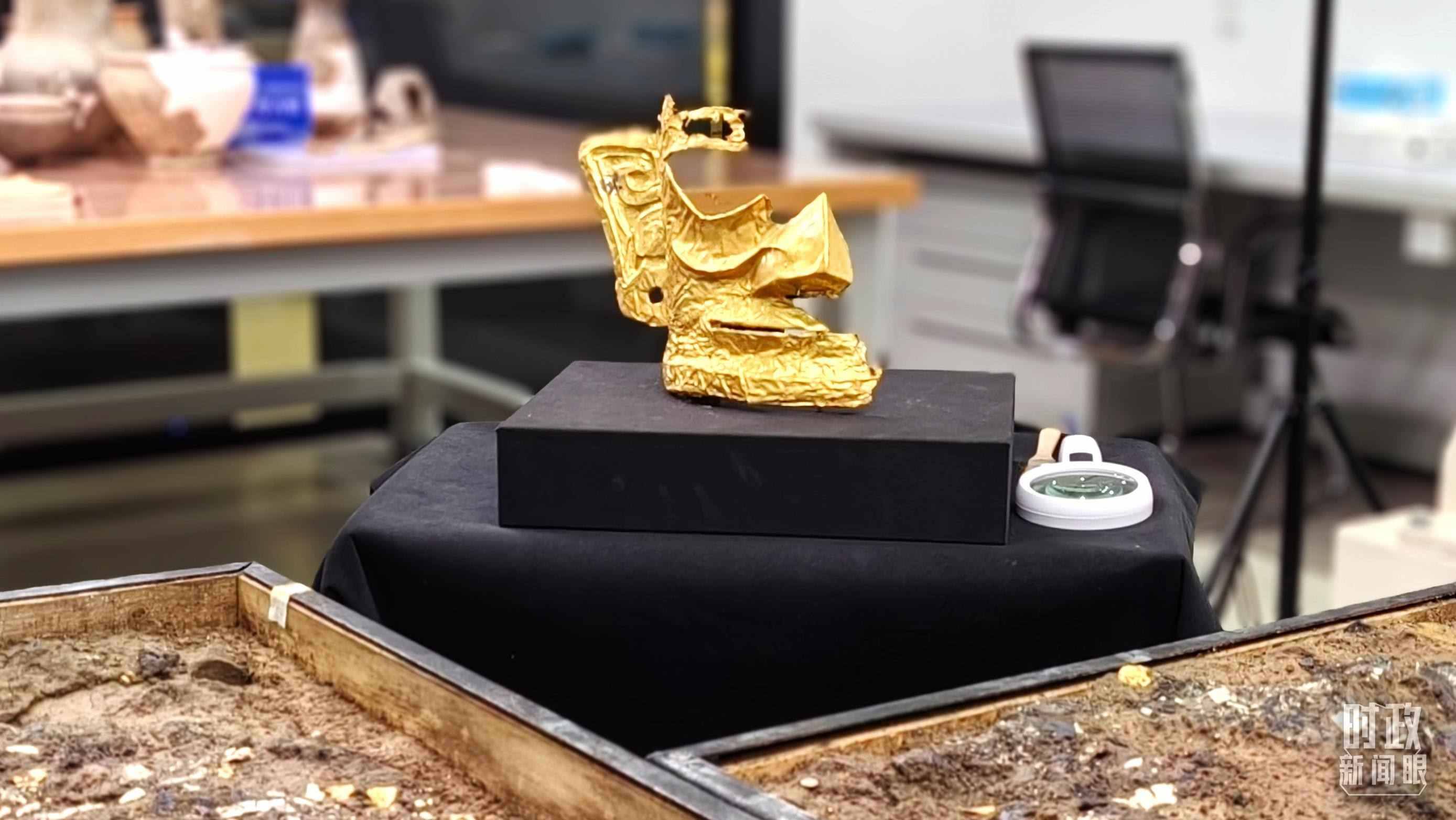△文物保護修復(fù)展示中心內(nèi)正在修復(fù)的金面具。(總臺央視記者王萌萌拍攝)