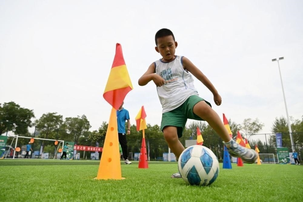 △2023年8月6日,一位小朋友在寧夏全民健身日主題示范系列活動現(xiàn)場體驗(yàn)趣味足球。