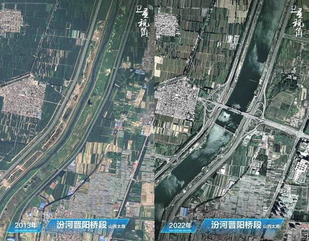 ↑2022年與2013年相比,通過(guò)綜合治理和生態(tài)景觀建設(shè),汾河太原城區(qū)晉陽(yáng)橋段水量更豐、風(fēng)光更美。