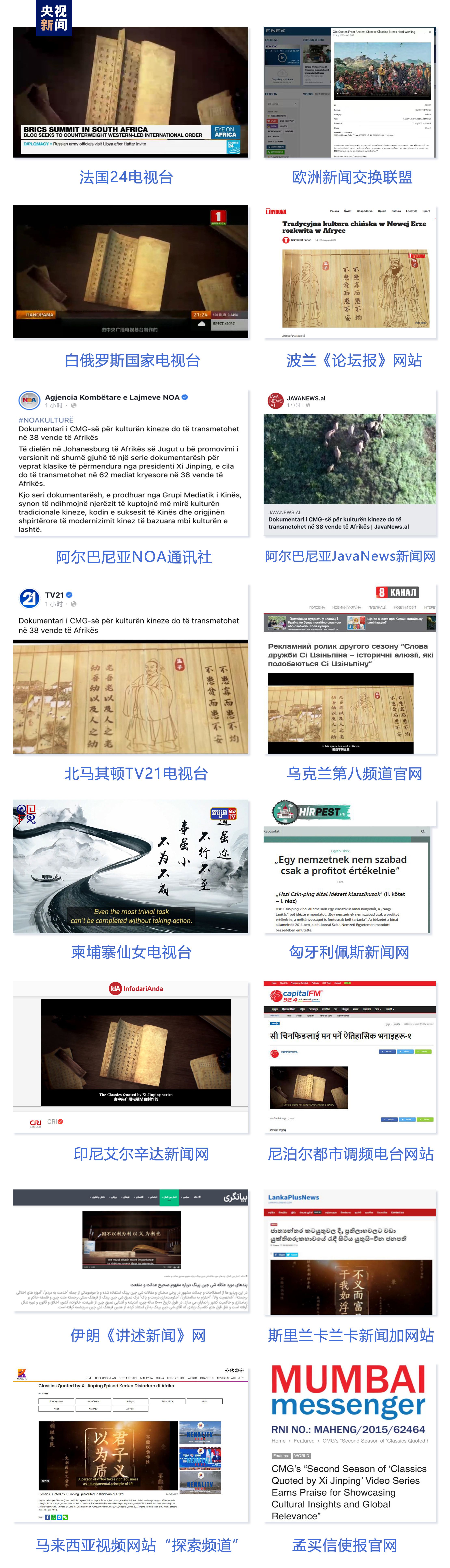 法國(guó)24電視臺(tái)、歐洲新聞交換聯(lián)盟、白俄羅斯國(guó)家電視臺(tái)、波蘭《論壇報(bào)》網(wǎng)站、阿爾巴尼亞NOA通訊社、北馬其頓TV21電視臺(tái)、烏克蘭第八頻道官網(wǎng)、匈牙利佩斯新聞網(wǎng)、柬埔寨東盟頭條新聞社、緬甸仰光傳媒、印尼艾爾辛達(dá)新聞網(wǎng)、尼泊爾都市調(diào)頻電臺(tái)網(wǎng)站等102家海外主流媒體紛紛轉(zhuǎn)播轉(zhuǎn)載《平“語(yǔ)”近人——習(xí)近平喜歡的典故》第二季多語(yǔ)種版本。