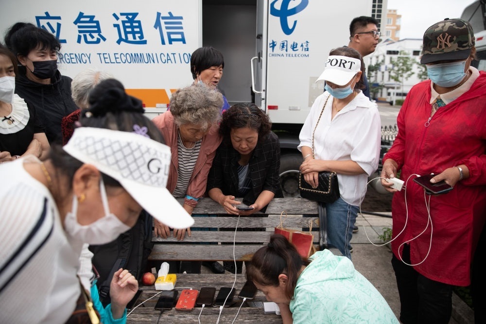 8月6日,群眾在黑龍江省海林市長(zhǎng)汀鎮(zhèn)一廣場(chǎng)上的應(yīng)急通信車前與外界通話。