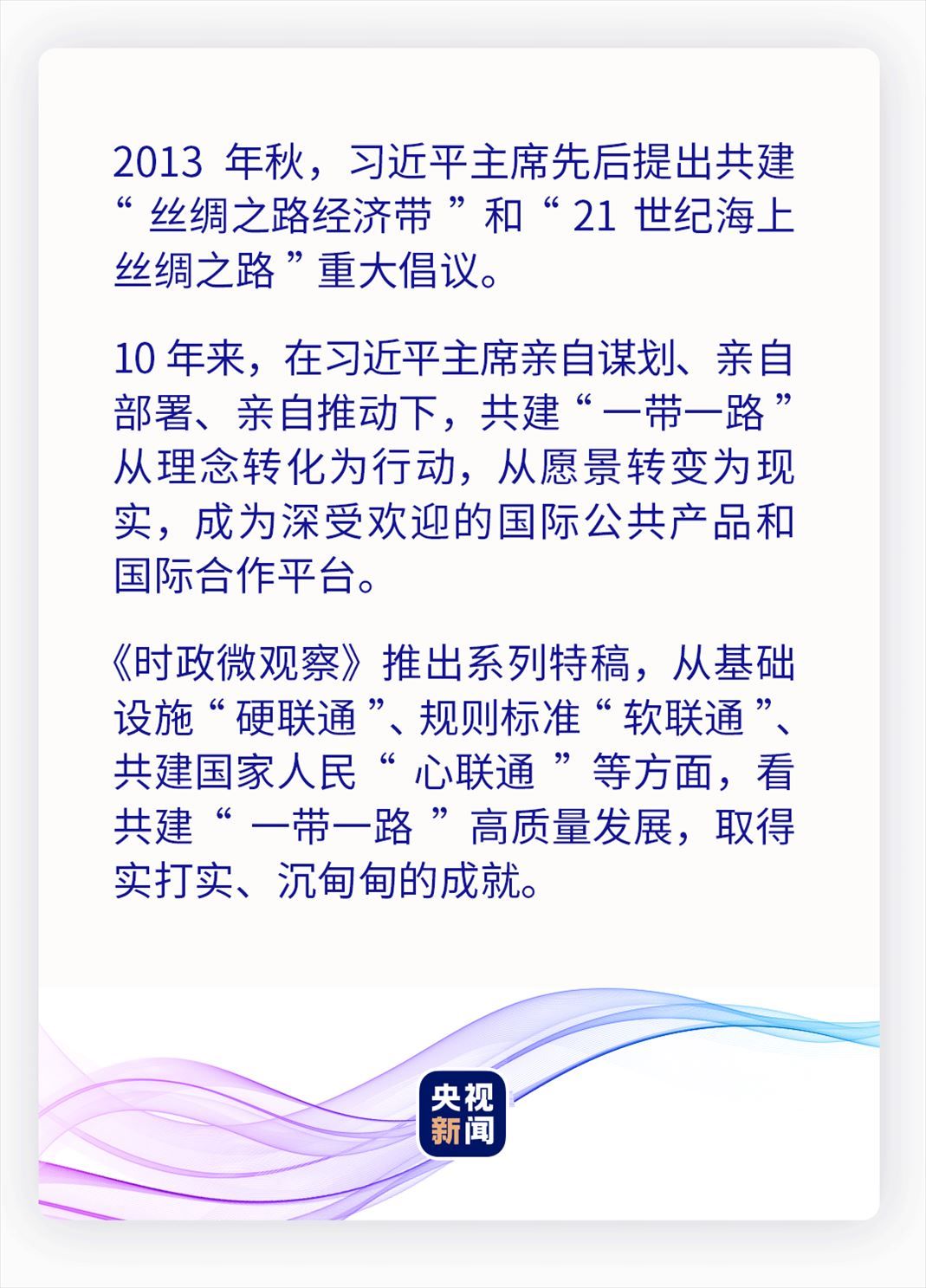 10年來(lái),中國(guó)與共建國(guó)家以基礎(chǔ)設(shè)施“硬聯(lián)通”為重要方向,攜手前行。在“鋼鐵駝隊(duì)”的汽笛聲里、在跨海大橋上的車(chē)流中、在“空中絲綢之路”的萬(wàn)米高空、在“數(shù)字絲綢之路”的“云端”……一條條幸福路、繁榮路,鋪就一幅共建“一帶一路”的壯闊畫(huà)卷。