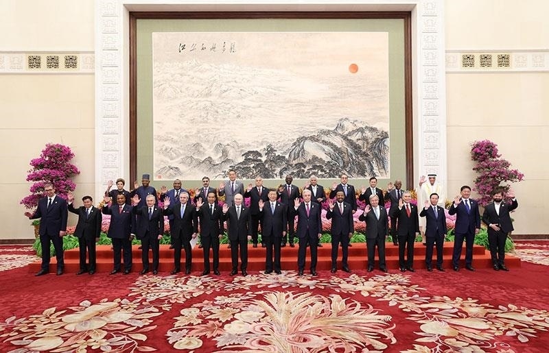△2023年10月18日,第三屆“一帶一路”國際合作高峰論壇開幕式前,習(xí)近平主席同出席高峰論壇的國際貴賓集體合影。