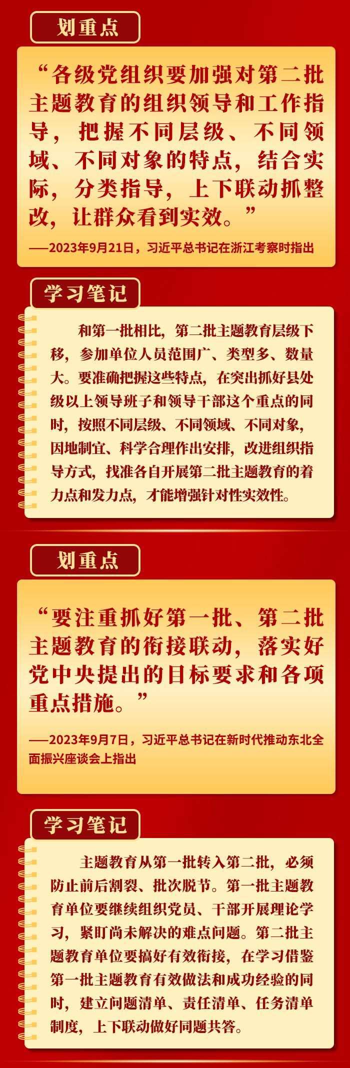 當(dāng)前,第二批學(xué)習(xí)貫徹習(xí)近平新時(shí)代中國(guó)特色社會(huì)主義思想主題教育扎實(shí)推進(jìn)。9月以來(lái),習(xí)近平總書(shū)記在黑龍江、浙江、江西考察時(shí),對(duì)第二批主題教育工作提出明確要求,為持續(xù)開(kāi)展好這件“事關(guān)全局的大事”指明方向。一起學(xué)習(xí)。