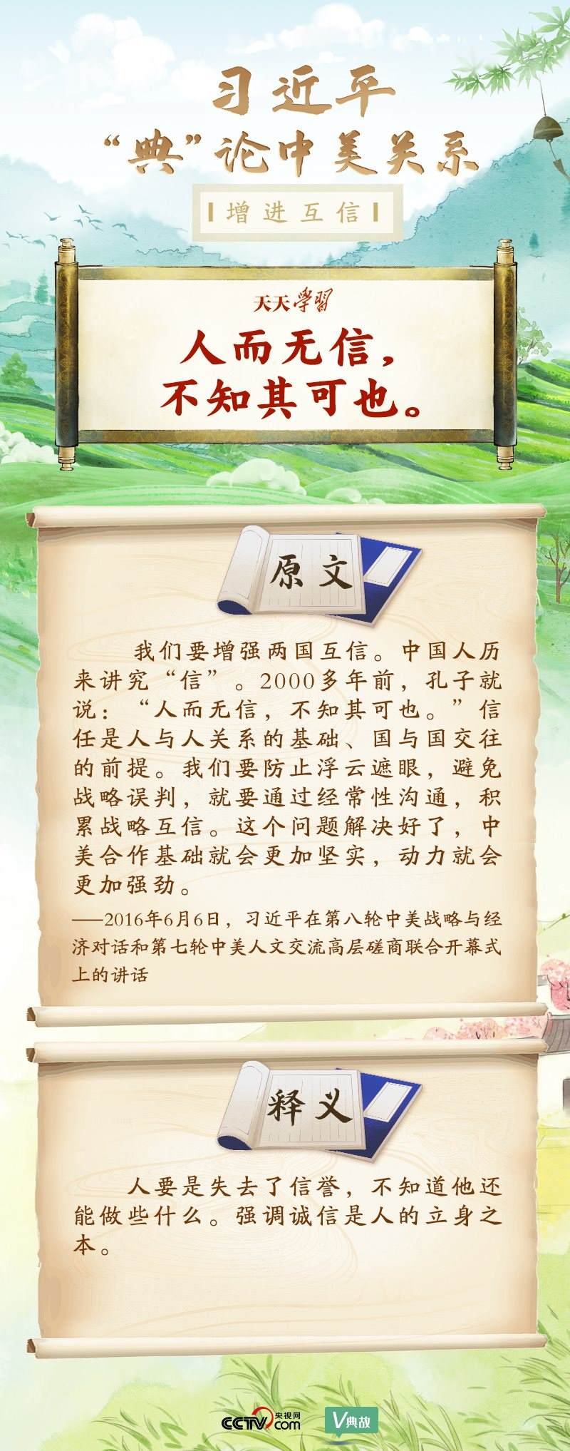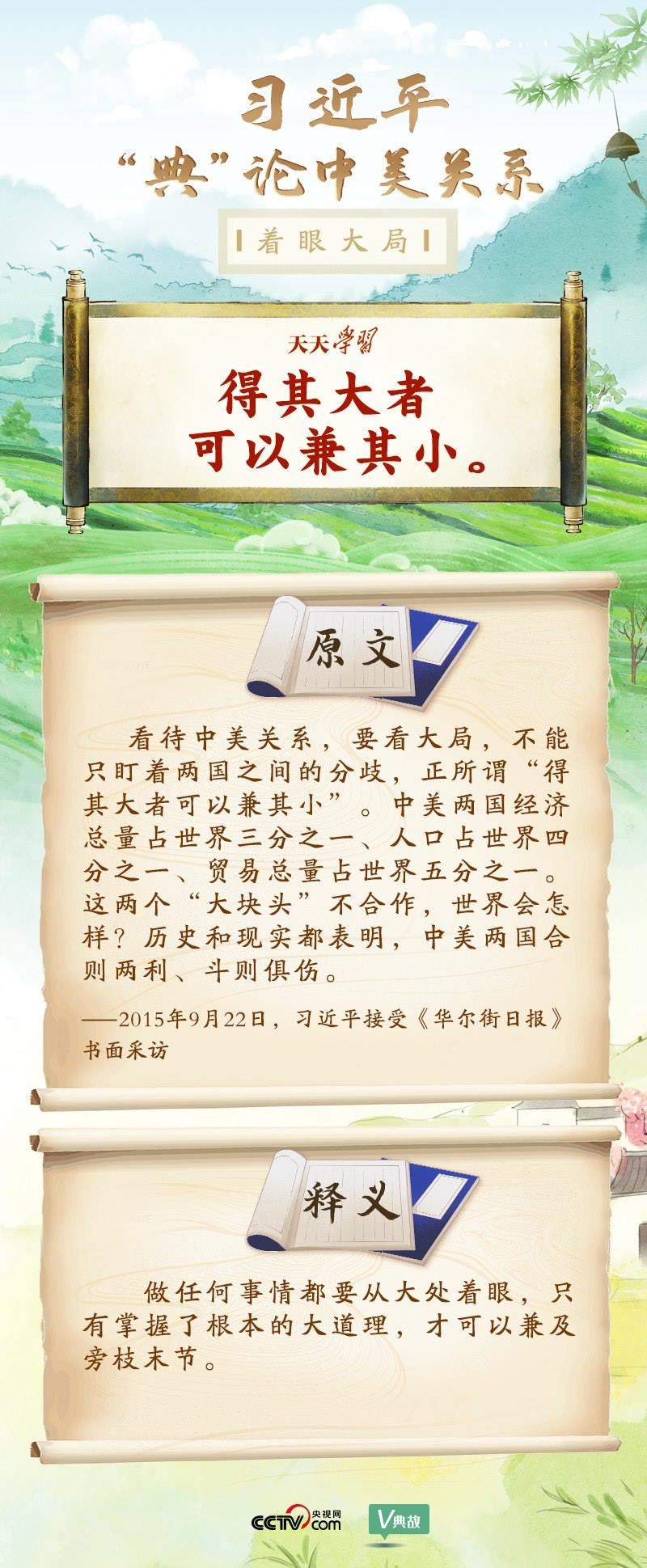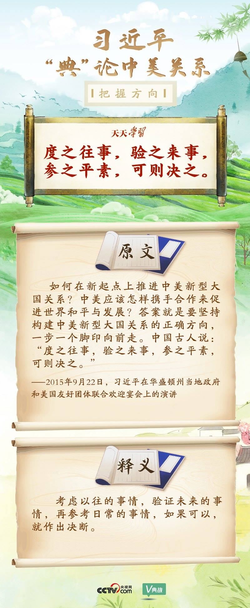 黨的十八大以來,習(xí)近平主席就中美關(guān)系發(fā)表了一系列重要講話。他站在時代高度分析、研判中美關(guān)系現(xiàn)狀及發(fā)展趨勢,并引經(jīng)據(jù)典為發(fā)展中美關(guān)系指出正確方向。這些論述蘊含深刻的戰(zhàn)略思維和政治智慧,具有重大現(xiàn)實意義和深遠(yuǎn)歷史意義。央視網(wǎng)《天天學(xué)習(xí)》與您一起深刻領(lǐng)會。