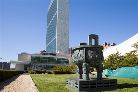 這是2015年9月15日在美國紐約聯(lián)合國總部拍攝的“世紀(jì)寶鼎”。“世紀(jì)寶鼎”是中國在1995年聯(lián)合國成立50周年之際,贈送給聯(lián)合國的禮物。新華社記者 李木子 攝