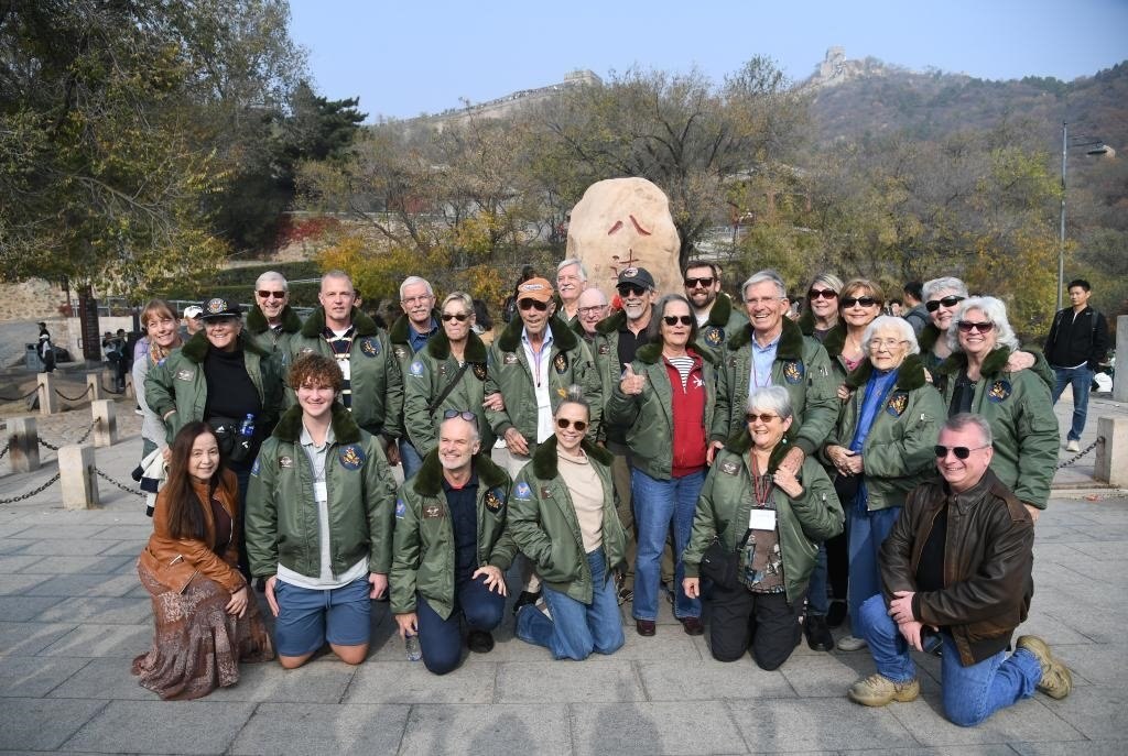2023年10月29日,飛虎隊(duì)老兵莫耶一行人在北京八達(dá)嶺長城合影留念。當(dāng)日,美中航空遺產(chǎn)基金會訪華代表團(tuán)成員陸續(xù)抵達(dá)北京。新華社記者 任超 攝