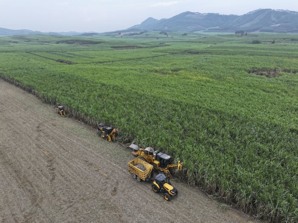 不遠(yuǎn)處,幾臺甘蔗收割機(jī)隆隆作響。當(dāng)?shù)弥笮透收崾崭顧C(jī)一天能收割180噸至200噸甘蔗,相當(dāng)于180個(gè)人工的工作量,總書記連連稱贊。