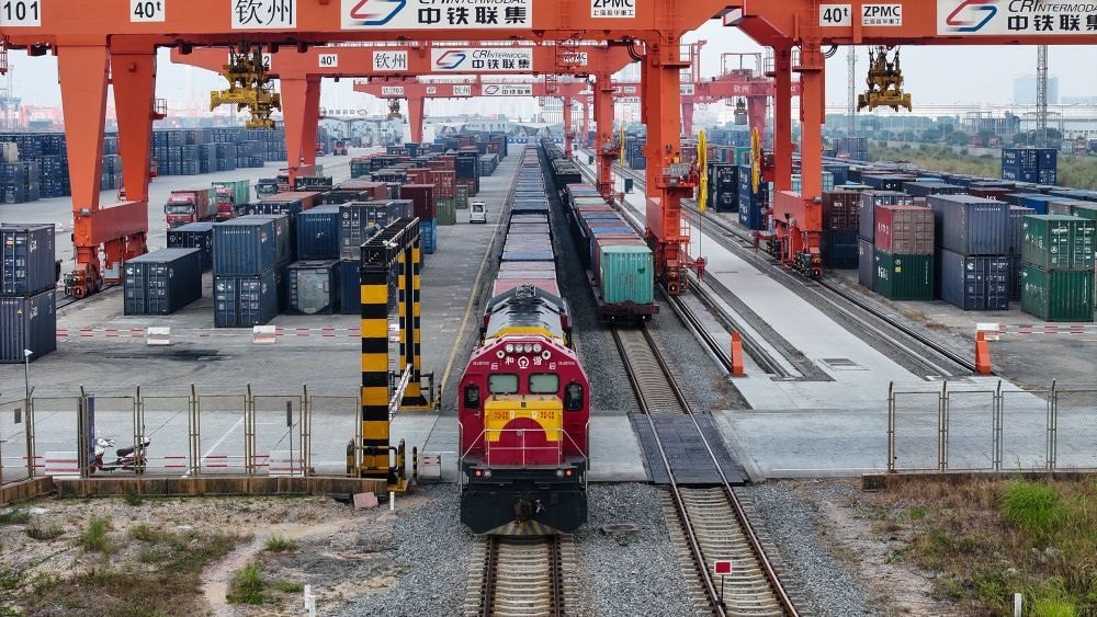 在欽州集裝箱中心站,鐵海聯(lián)運(yùn)班列整裝待發(fā)(11月24日攝,無人機(jī)照片)。新華社記者 張愛林 攝
