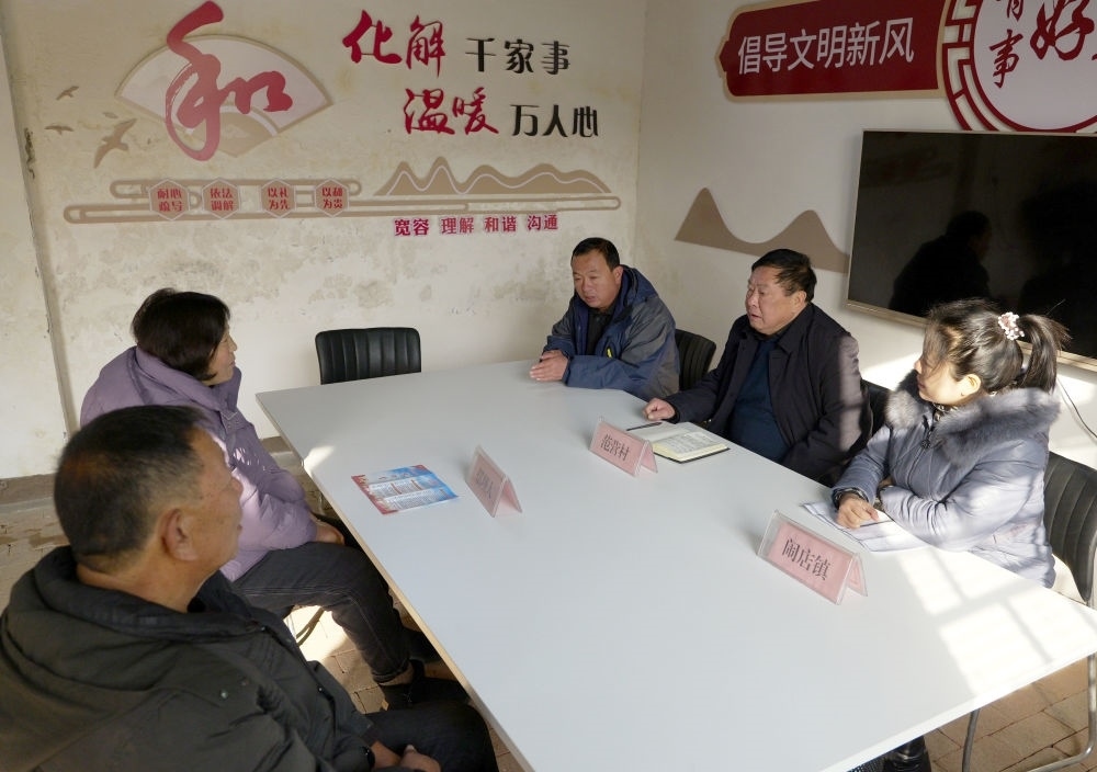 在寶豐縣鬧店鎮(zhèn)范營村“擺理堂”,村鎮(zhèn)干部(右)為村民進(jìn)行信訪調(diào)解(2023年12月20日攝)。河南省寶豐縣積極推進(jìn)四下基層工作深入開展,已打造鬧店鎮(zhèn)范營村“擺理堂”、石橋鎮(zhèn)東大莊村“老娘舅茶室”等系列鄉(xiāng)村社區(qū)服務(wù)陣地,協(xié)調(diào)鄰里關(guān)系,有效化解各類矛盾,同時不斷豐富工作內(nèi)容,拓展服務(wù)功能,助力鄉(xiāng)村振興。新華社記者 李嘉南 攝