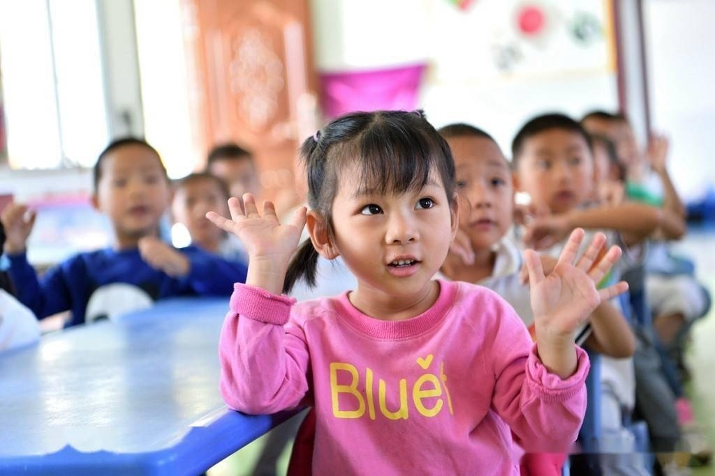 ▲襄陽(yáng)市??悼h馬良鎮(zhèn)重陽(yáng)村幼兒園里,孩子們?cè)趯W(xué)習(xí)手指歌
