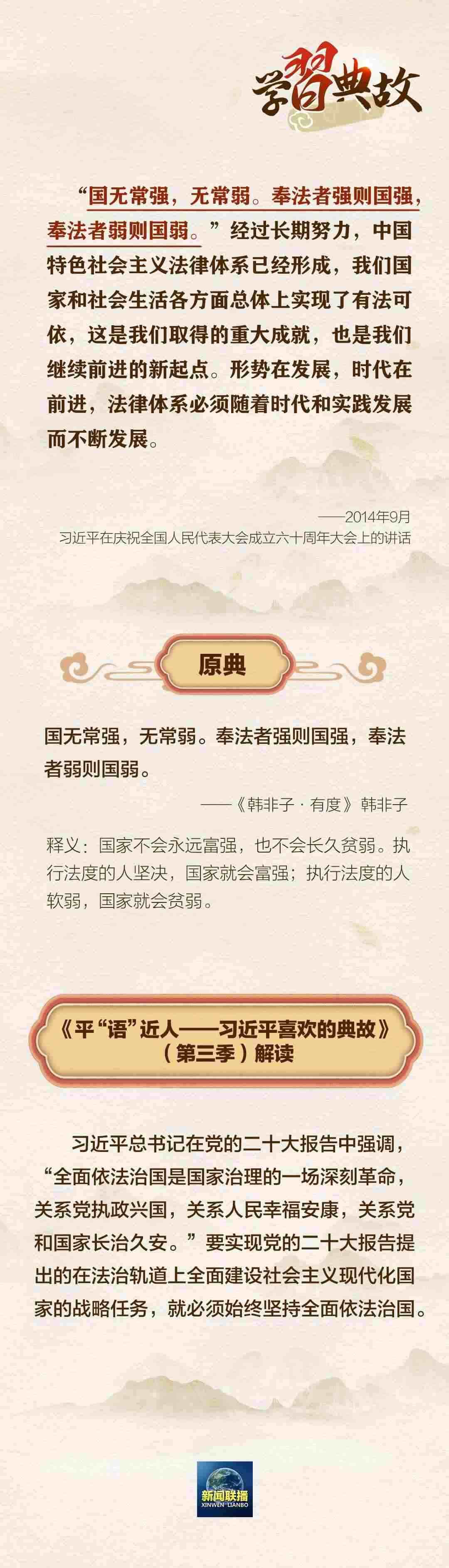 黨的二十大報(bào)告將法治建設(shè)單獨(dú)作為一個(gè)部分進(jìn)行專章論述、專門部署,這充分體現(xiàn)了以習(xí)近平同志為核心的黨中央對(duì)法治建設(shè)的高度重視。圍繞“全面依法治國(guó)”這一主題,總書記曾講到哪些典故?一起學(xué)習(xí)↓↓↓