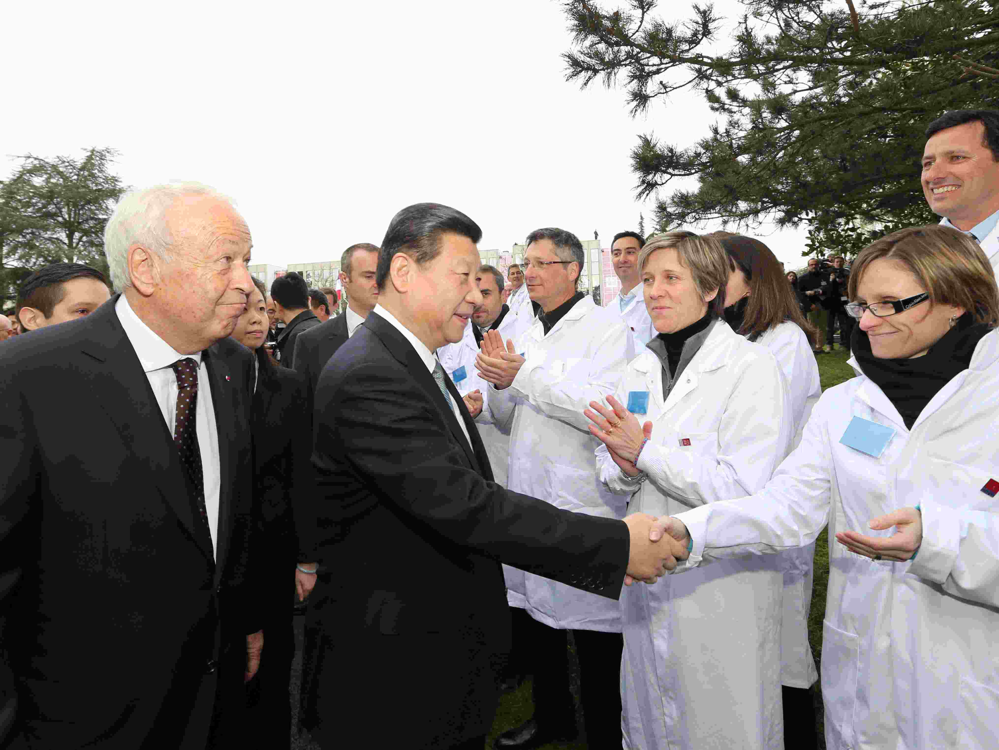 △2014年3月26日,習(xí)近平主席在法國里昂參觀梅里埃生物科研中心,與科研中心員工握手。